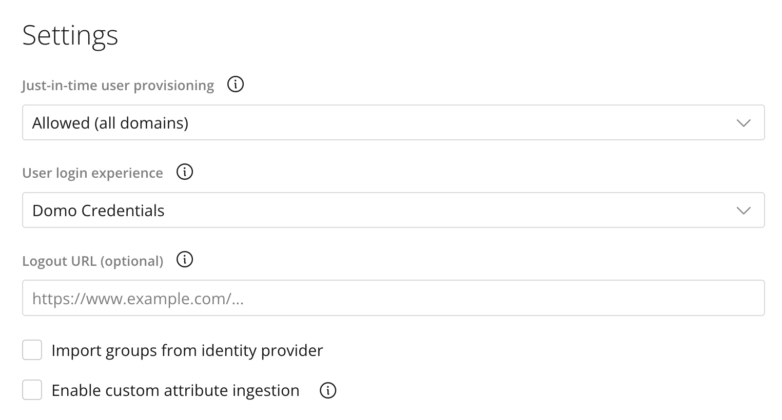 | Logout URL (optional) | — | The URL users are redirected to when they log out of Domo. |