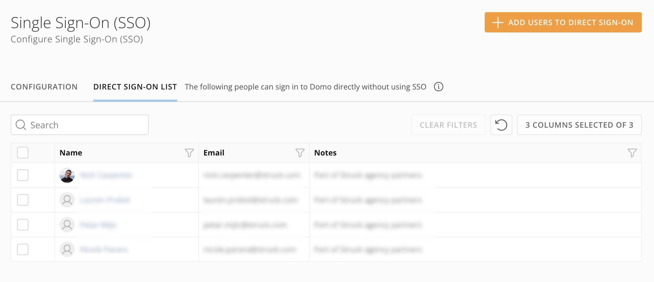 When enforced, the Direct Sign-on List designates the Domo users who can log into Domo directly with Domo credentials; other users must log in via SSO. The Direct Sign-on List is enforced if SAML is enabled and the SAML “User login experience” is set to “SSO (Domo auth screen)” or “SSO (skip to IdP)”.