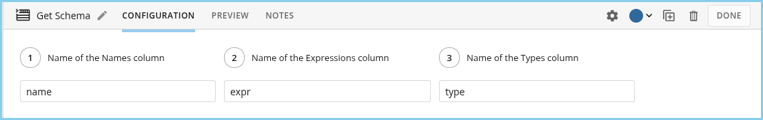 name, expr, and type from their Configuration Input, and all Get Schema tiles are configured with those same column names.