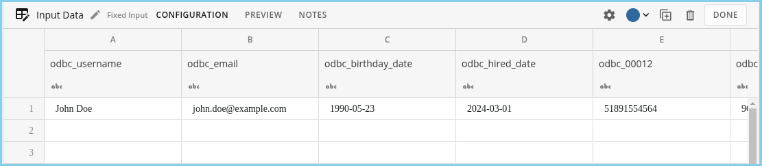 typescolumn (data type:STRING) that contains the desired data types of the columns to be created. It must not contain null or empty values. Valid values areSTRING,LONG,DOUBLE,DECIMAL,DATE,DATETIME,BOOLEAN,DURATION, andPERIOD.
