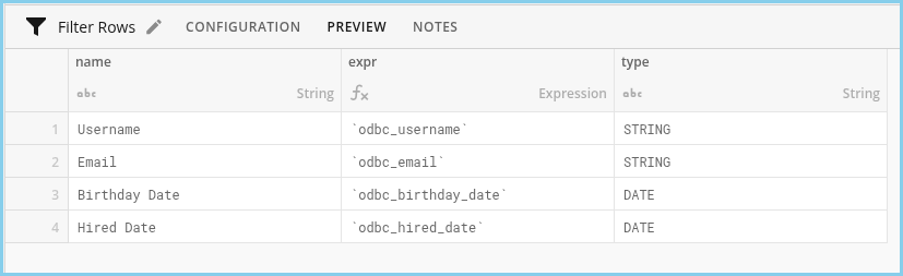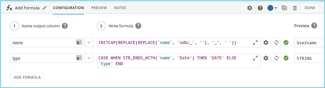 Next, we need to generate our three Configuration Input columns, using names that will match those from the Get Schema tile: name, expr, and type. We’ll use an Add Formula tile with the following formula for name: