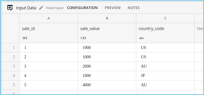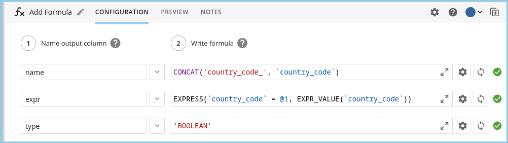 name and type don’t contain anything we haven’t seen before, but expr involves a new function: EXPR_VALUE(). Consider the result table at this point in the graph (Add Formula). Note how the reference to country\_code from the template has remained unchanged; the result expression still references that column on the left side of the equals.