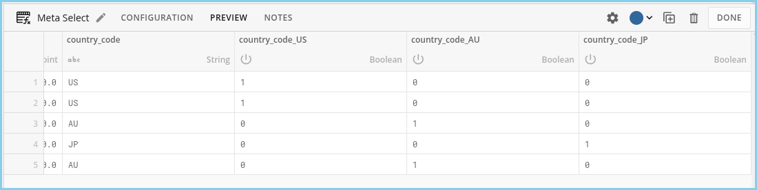 This final example goes beyond modifying and reducing the output of a Get Schema tile to produce the Meta Select tile’s Configuration Input. This time, we generate additional Configuration Input rows and union them to the Get Schema tile in order to add a variable number of calculated columns to the final result. One-hot encoding is an important step in many statistical analyses. It begins with a “categorical column”, which is a name for a non-numeric column (usually aSTRING ) with relatively few unique values. Country of Origin, Company Name, and Department are common examples.