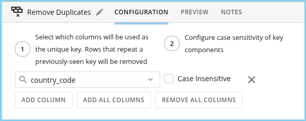 country\_code. We configure the Remove Duplicates to use country\_code alone as the unique key.