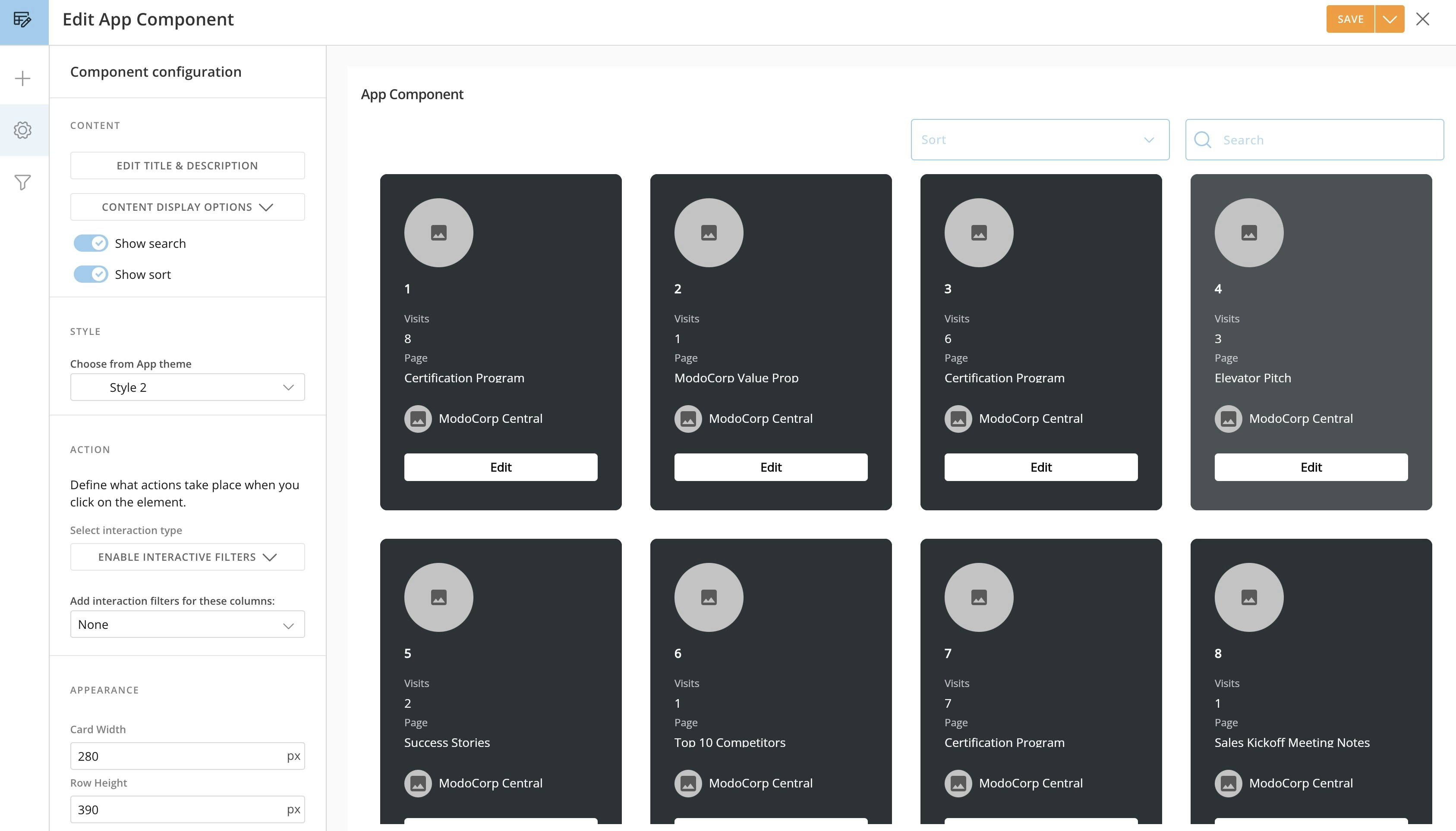 Through the styling panel, you can customize the appearance of your app component’s container and item styles, as well as modify any buttons, banners, or texts. Follow these steps to customize your app component:- Navigate to Edit App Component modal > Component configuration (tab).