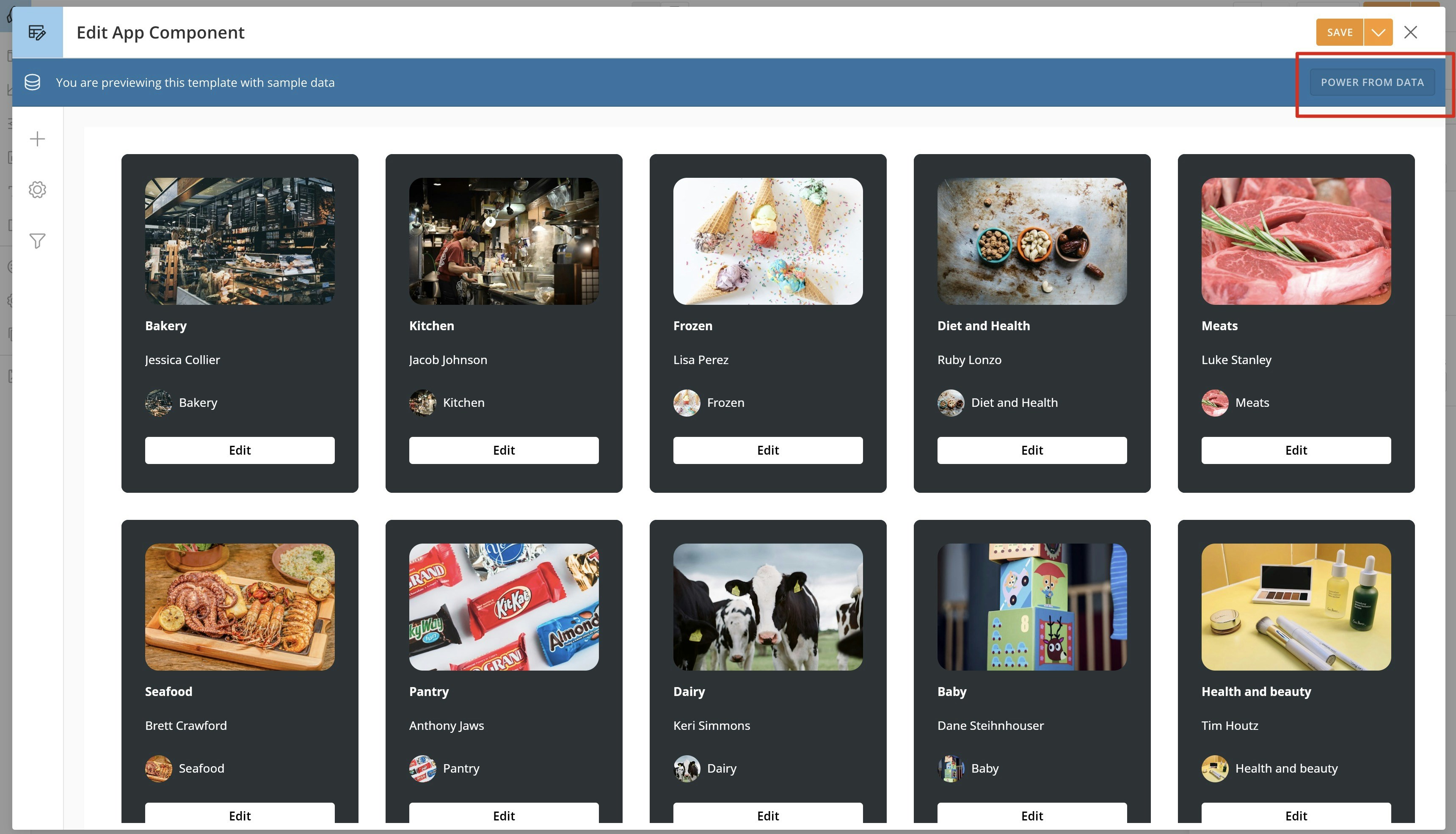 To change the DataSet powering your component, follow these steps:- Navigate to the Edit App Component modal.