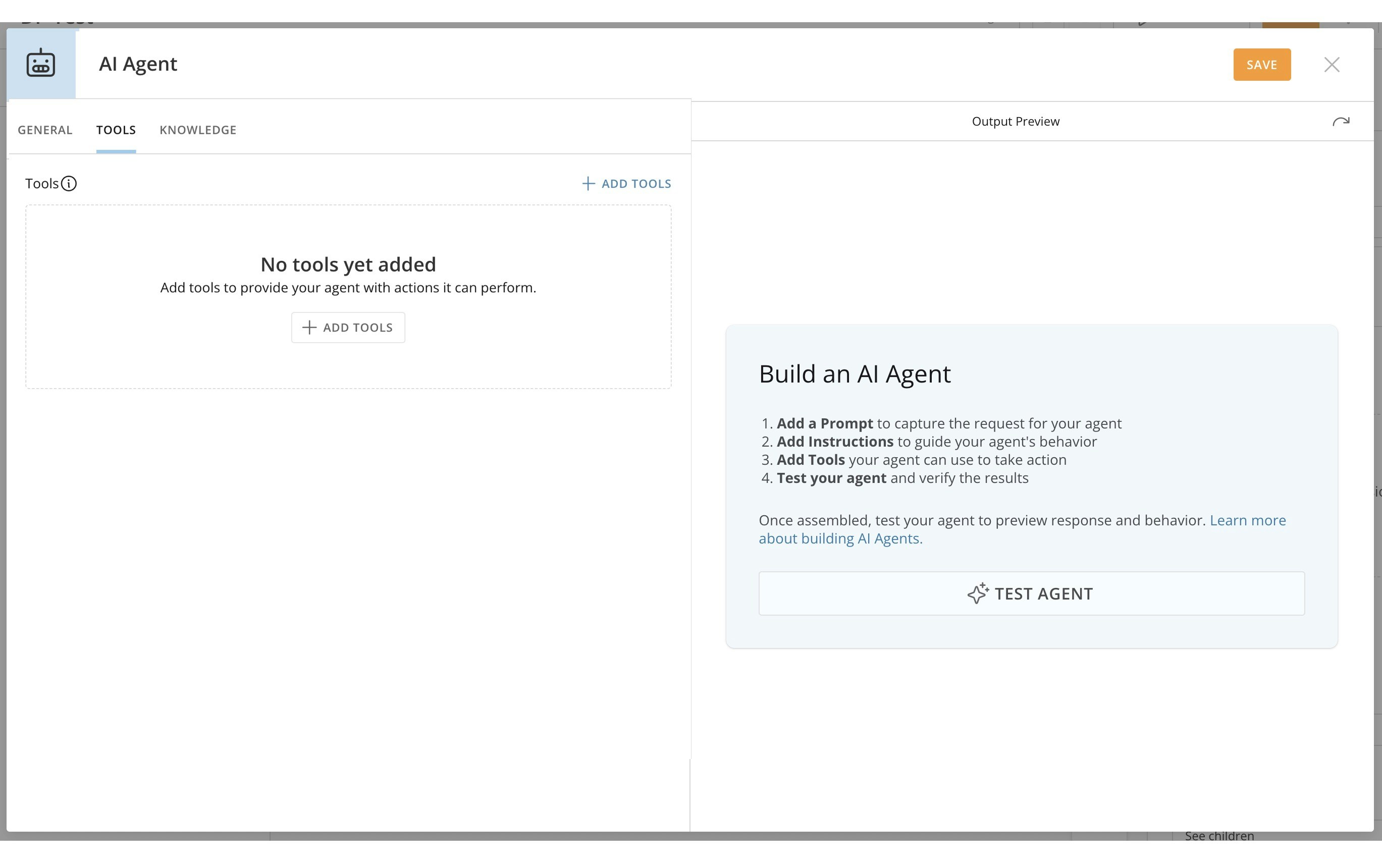 - While configuring your agent, use the Save option in the top right of the agent modal often to avoid losing updates to your agent.