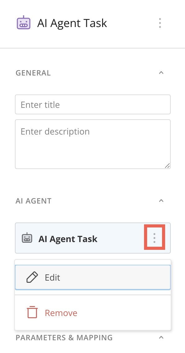 In the workflow’s right configuration panel, select the three vertical dots icon > Edit to reopen the agent modal and make changes to the agent.