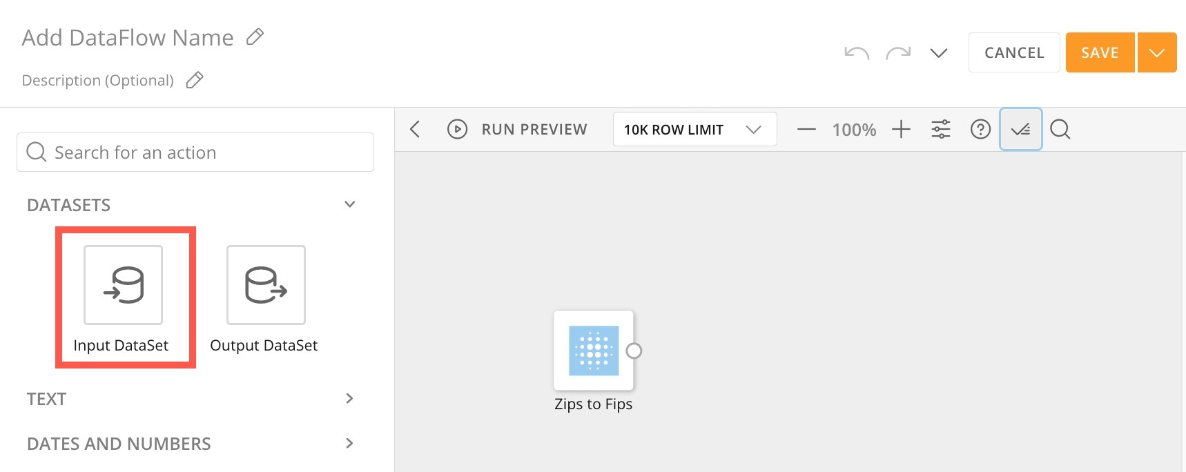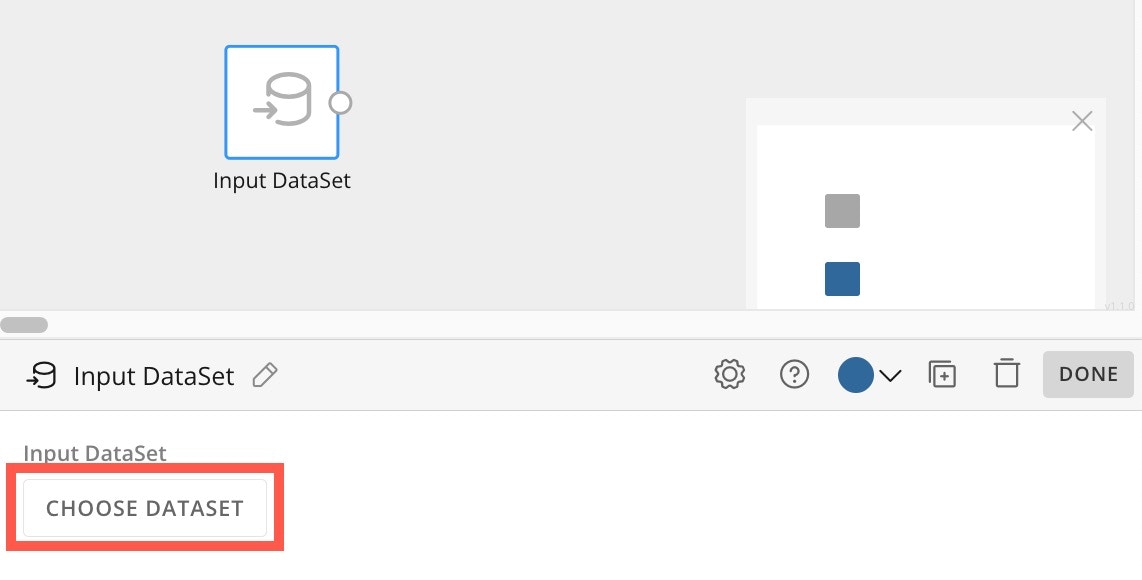 - From the panel to the left of the canvas under DataSets , drag an Input DataSet tile to the canvas.