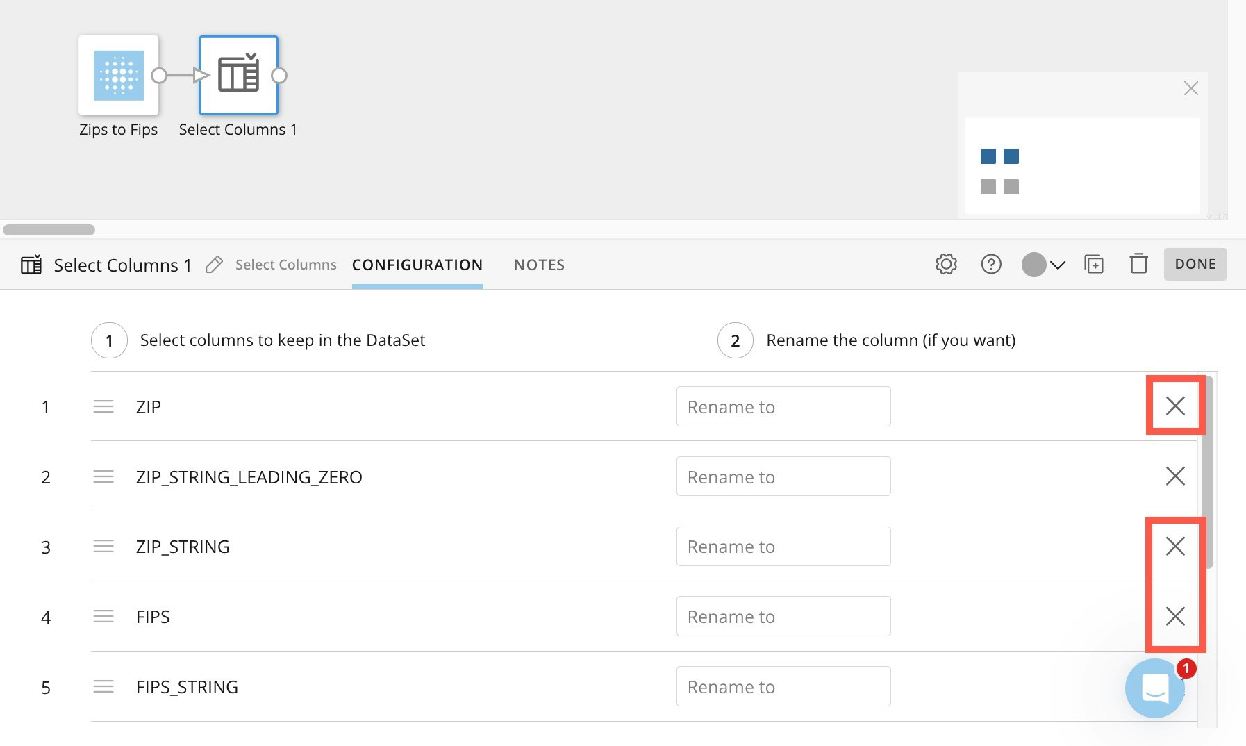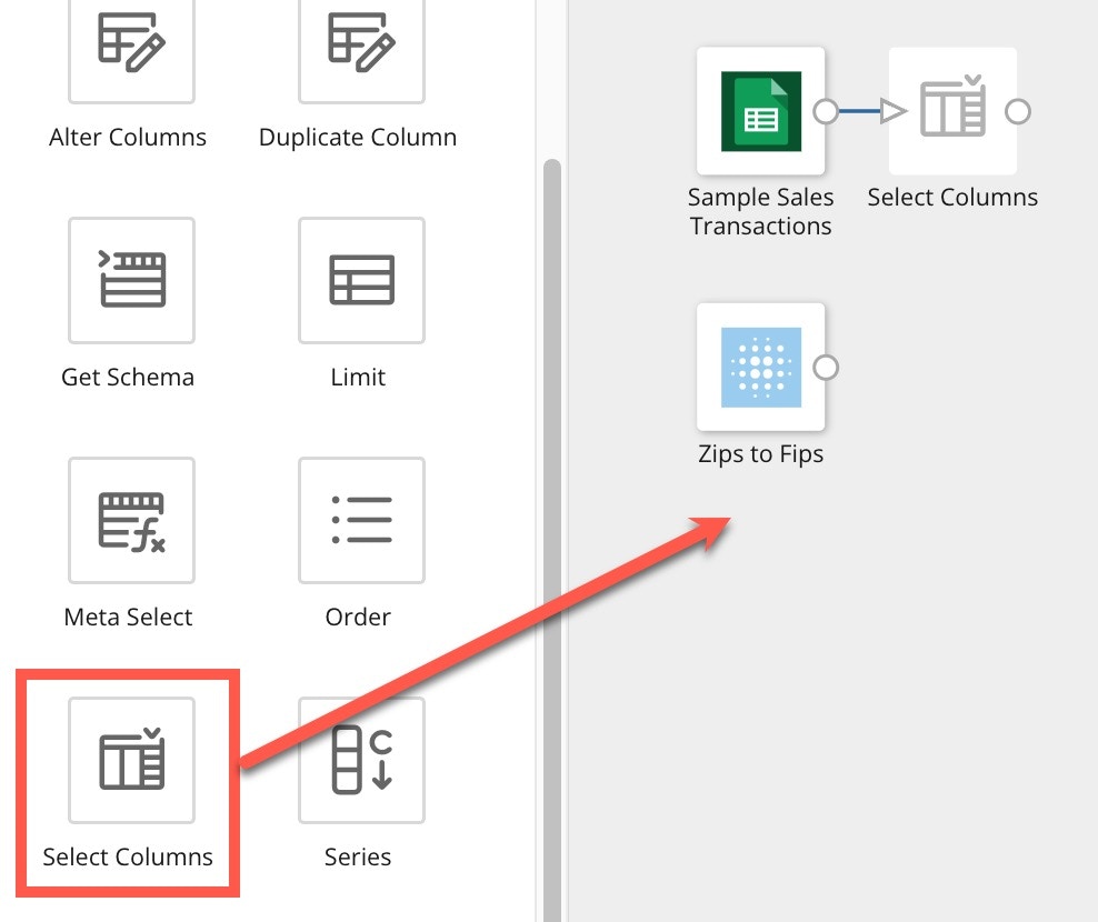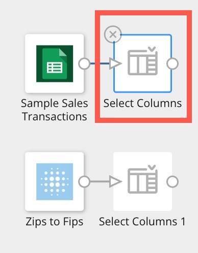 - Add a second Select Columns tile and connect it to the Zips to Fips data.