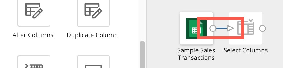 - From the left panel under Utility , drag a Select Columns tile to the canvas and connect the node for the Sample Sales Transactions data to it by clicking and dragging.