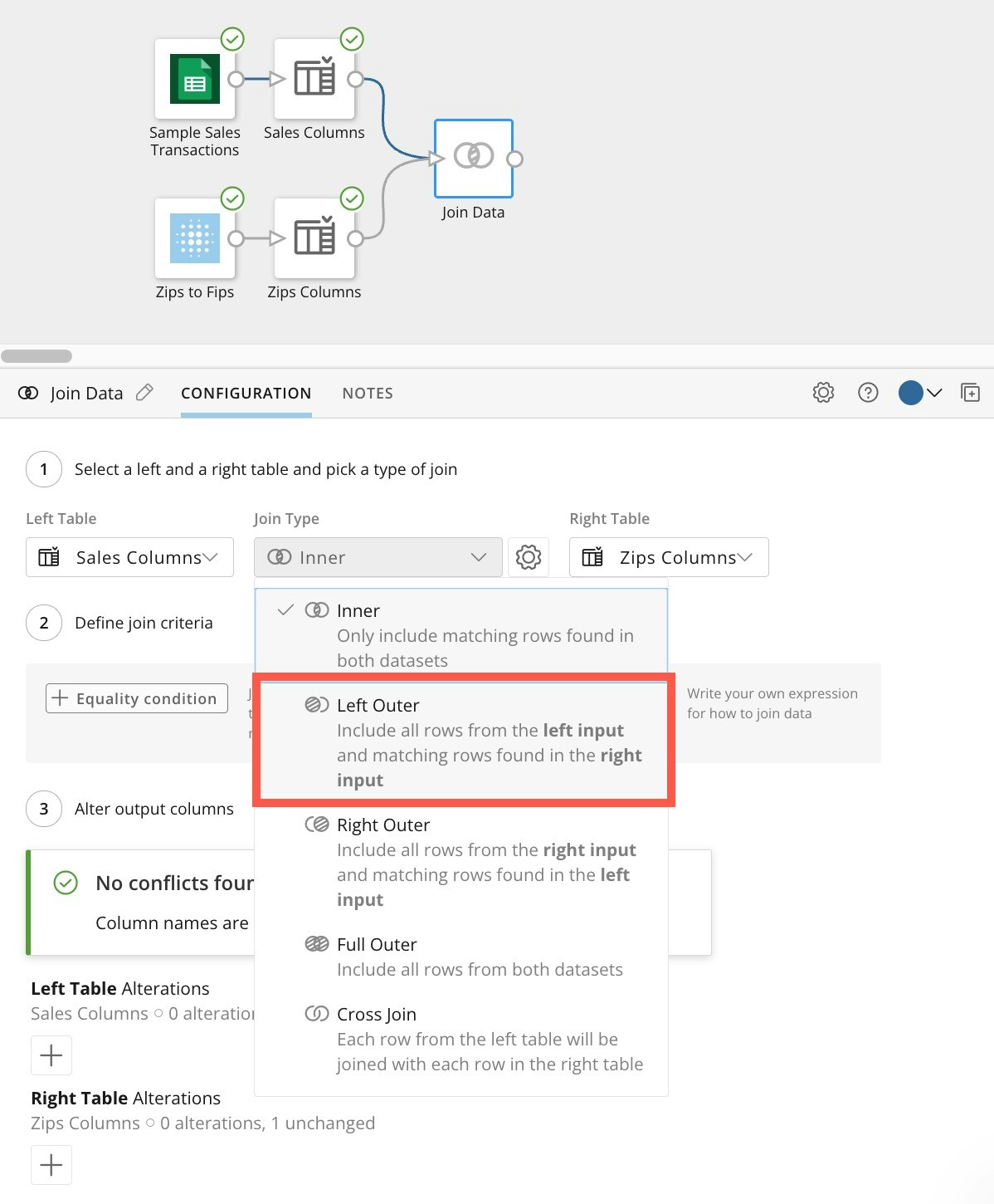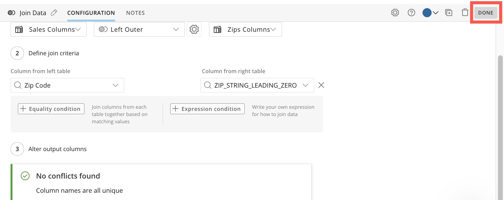 - Drag the right node from the Sales Columns tile to the triangle on the Join Data tile to connect them. Repeat for the Zips Columns tile.