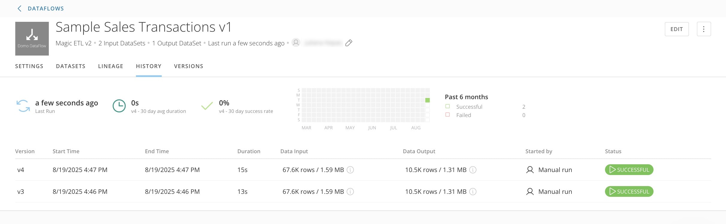 - When finished, select Save and Run. Wait while the DataFlow runs and opens in the History tab of the DataFlow details.