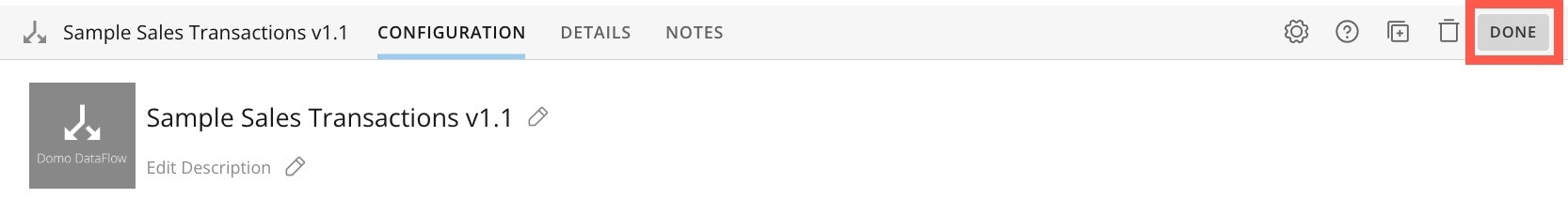 - Use the Save option in the top right corner of the canvas often to preserve your DataFlow. You can make notes about the version or simply save.