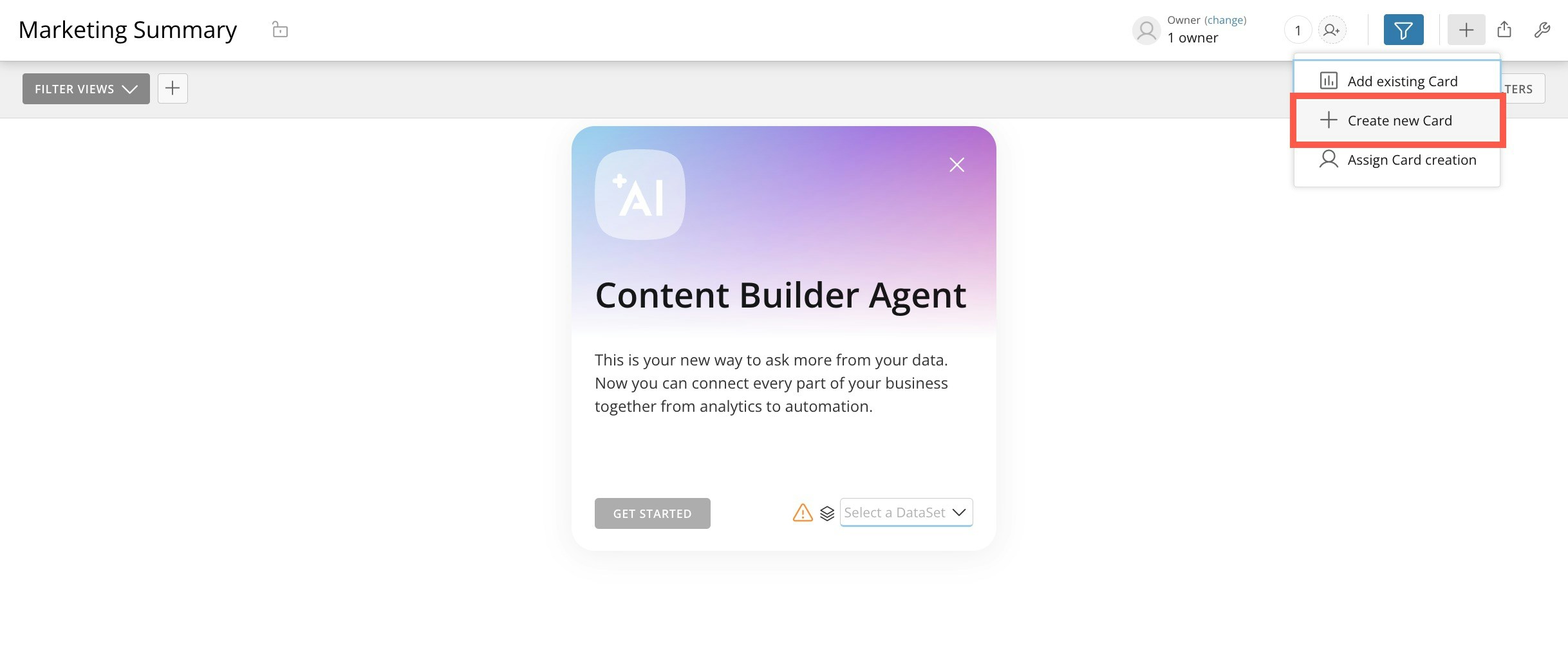 - Go to your new dashboard and select Add (plus icon) > Create new Card.