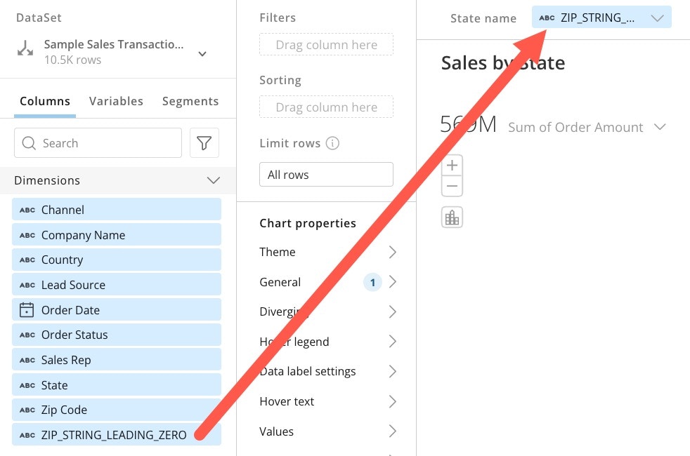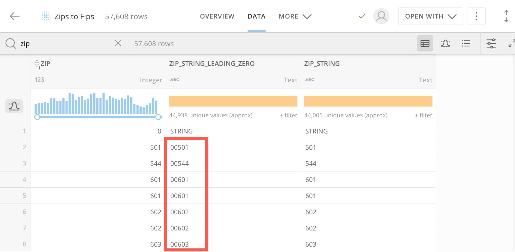ZIPandZIP\_STRINGcolumns don’t retain leading zeroes. We need the leading zeroes to match against our sales data, so we want to use theZIP\_STRING\_LEADING\_ZEROcolumn.