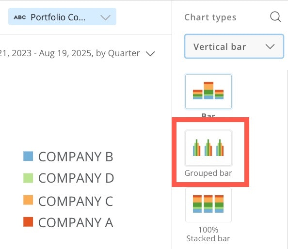 - In the Chart types panel on the right side of the screen, use the dropdown to go to Vertical b ar > Grouped bar.