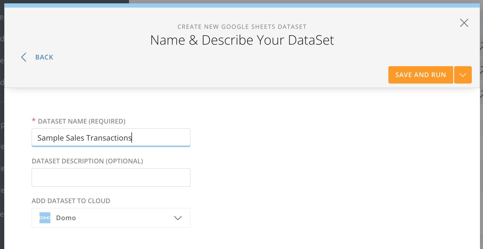 - Give your DataSet a name and optional description so you can easily identify it later. Select Save and Run.