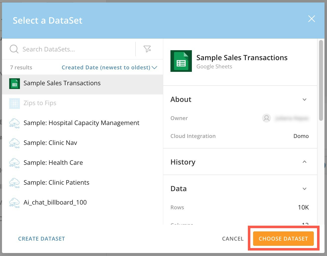 Sample Sales Transactionsand select Choose DataSet to return to the canvas.