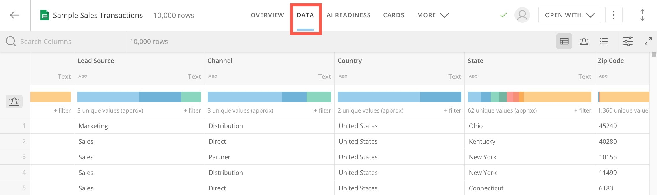 Sample Sales Transactions and look at the Data tab to understand its structure and identify the column it shares with the Zips to Fips data. in this case, the ZIP code. Here, the column is called