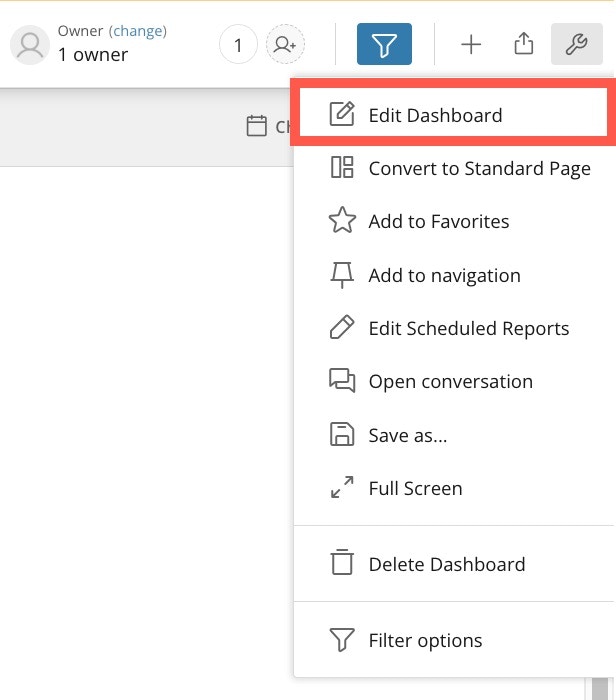 - At the top right of the dashboard, select Settings menu (wrench icon) > Edit Dashboard.