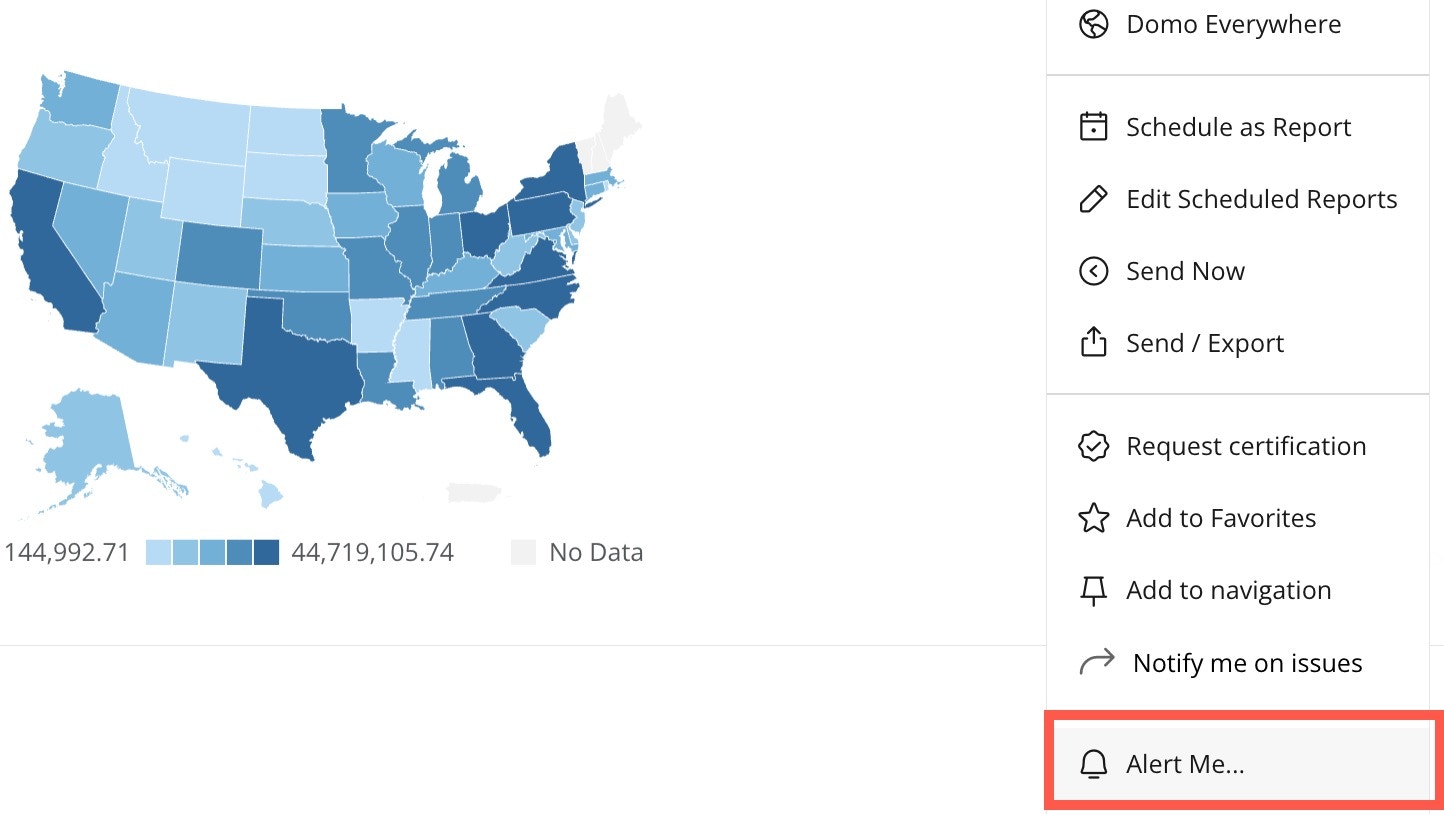 Domo Alerts is a powerful tool that can help you monitor specific conditions within your data and notify you when these conditions are met. This guide describes how to set up effective alerts for the five cards you built using the Marketing DataSet.- From the dashboard or appendix, hover over a card and select Card options (wrench icon) > Alert Me….