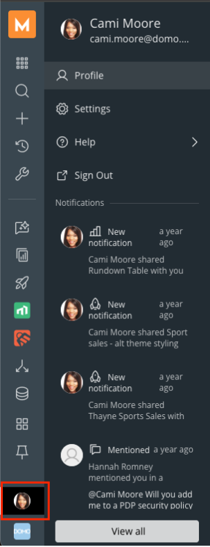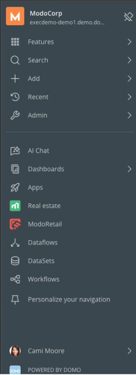 You can find Domo Navigation on the left side of your browser window from every screen in Domo—except full-screen editors like those in Workflows or App Studio.