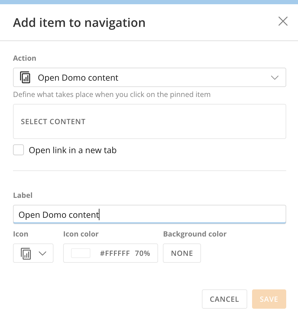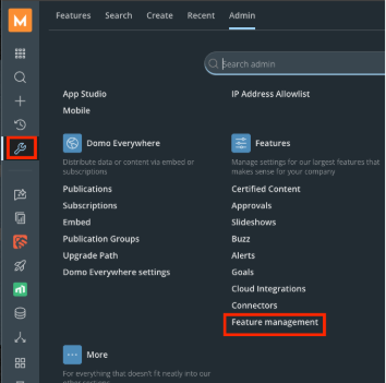 - Open a feature — Choose the Domo feature to open and whether to open it in a new browser tab.