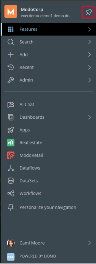 When the Domo Navigation is unpinned, it hovers over the rest of the screen. When you select the pin icon in the left corner of the expanded navigation, it stays in the fixed location and does not cover any part of the screen. To lock and unlock the expanded state of the navigation, select the pin icon