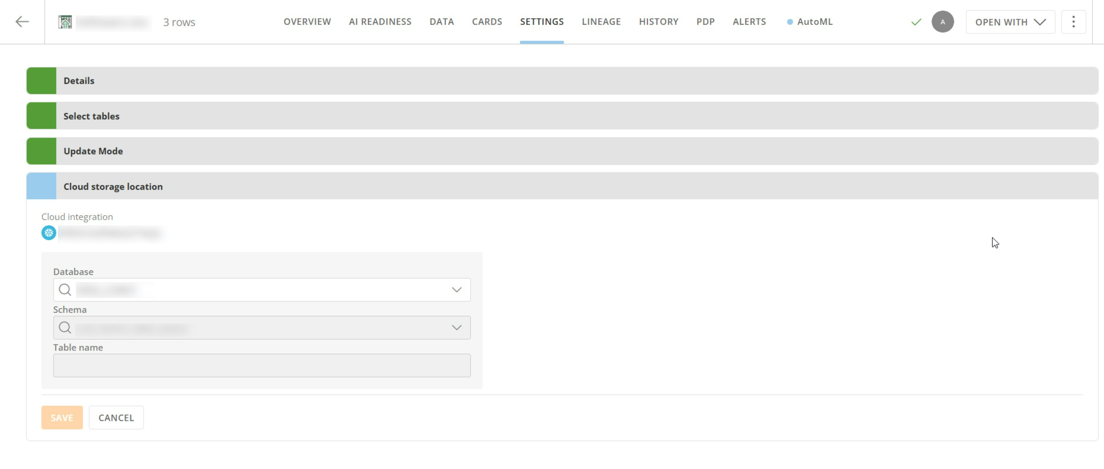 The Cloud Data Location configuration for BigQuery, Databricks, and Oracle NSAW improves governance by allowing you to move basic information between databases and schemas. Functionalities include:- Ability to change the database and/or schema of Domo-written DataSet.