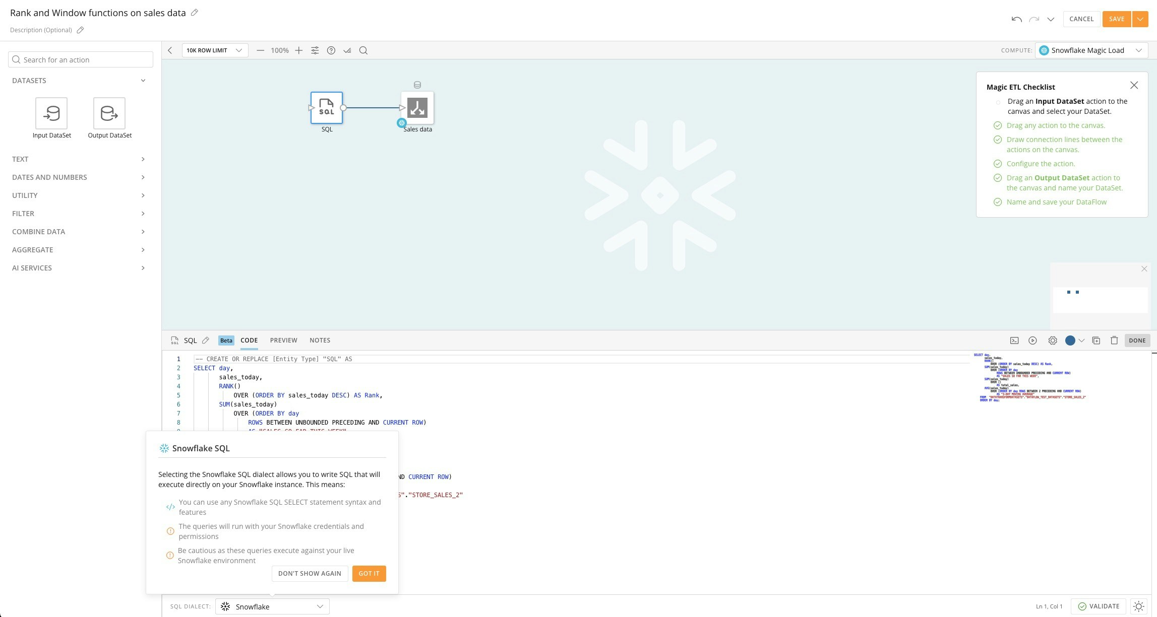 Window functions in the SQL tile allow you to use complex analytical functions in your Magic ETL DataFlows without resorting to using a Redshift DataFlow or creating a mess in Magic ETL. Perform calculations like running totals, rankings, moving averages, and cumulative statistics from within your SQL tile.