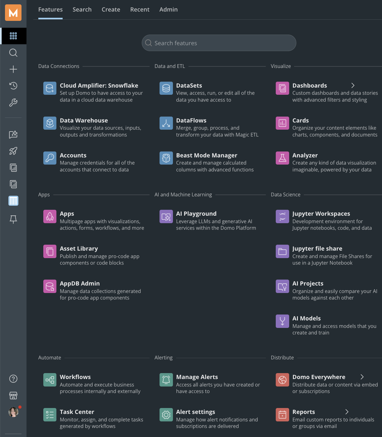 The new navigation allows you to customize your navigation, quickly view your full product listing, pin frequently used items, and use the quick search to save time and take better advantage of the Domo platform.