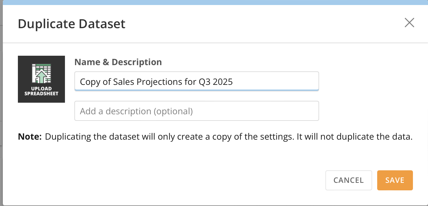 The new customer-facing clone DataSet functionality allows you to create a new DataSet that is a copy of an existing DataSet. The new, copied DataSet retains the same settings as the original, except for scheduling settings, and saves you from having to recreate DataSets manually.