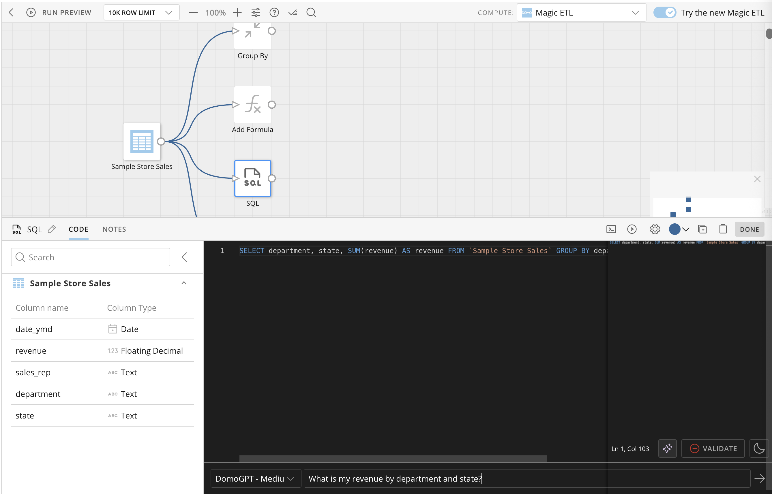 You can now use AI-powered text-to-SQL and text-to-formula capabilities throughout Magic ETL. These enhancements allow you to create complex queries and formulas by describing your needs in natural language and having the tiles transcribe them back to you.