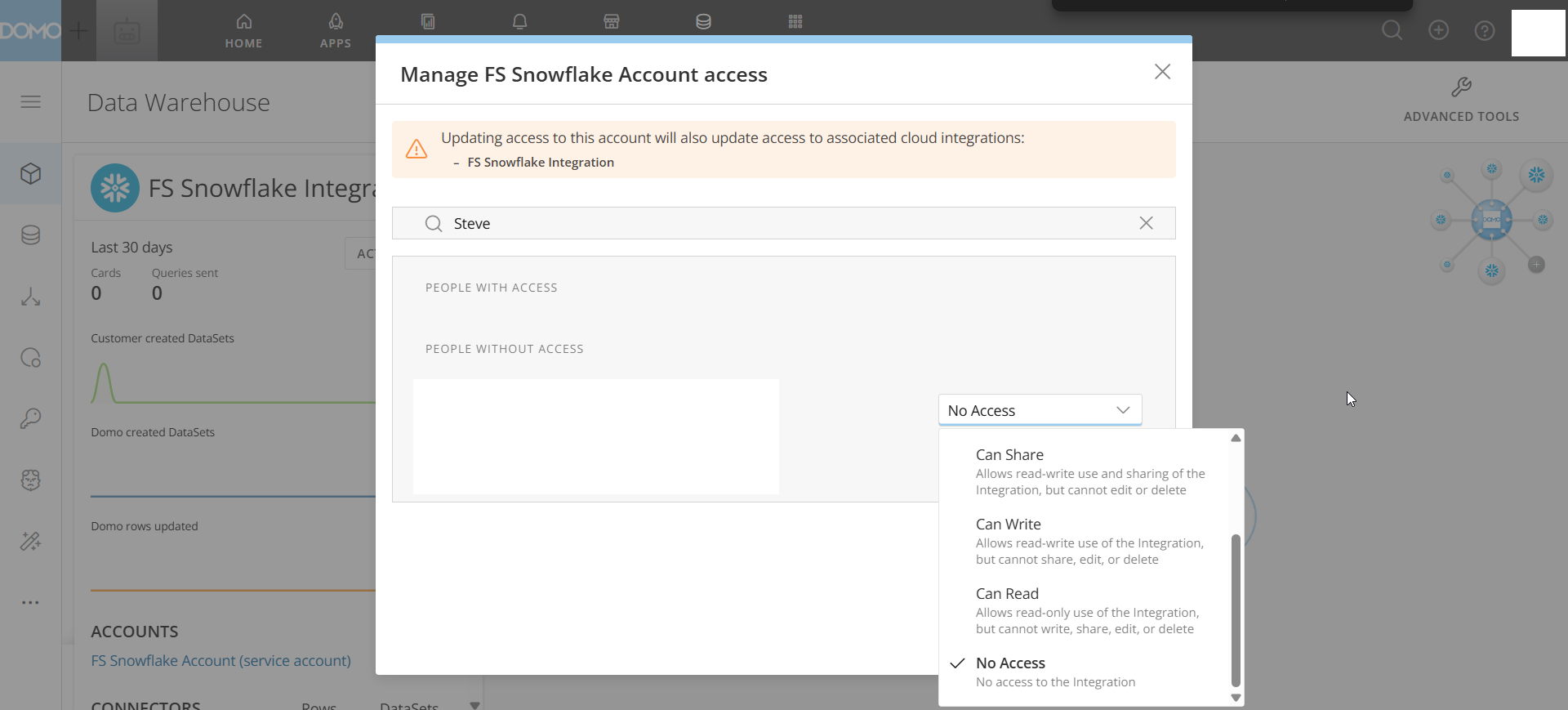 Cloud Integration Sharing allows multiple users to access a Cloud Integration, extending access control and collaboration. This feature is available for Databricks, BigQuery, Oracle NSAW, and Snowflake connections.