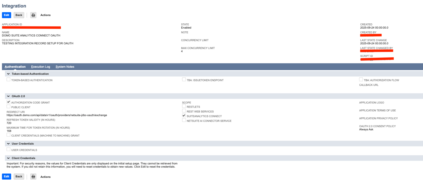 - Click Save. Once the integration is created successfully Consumer Key/Client ID & Consumer Secret/Client Secret are shown under Client Credentials Tab. Note: For security reasons, the values for Client Credentials are only displayed on the initial setup page. They cannot be retrieved from the system. If you did not retain this information, you will need to reset your credentials to obtain new values. Click Edit to reset the credentials.