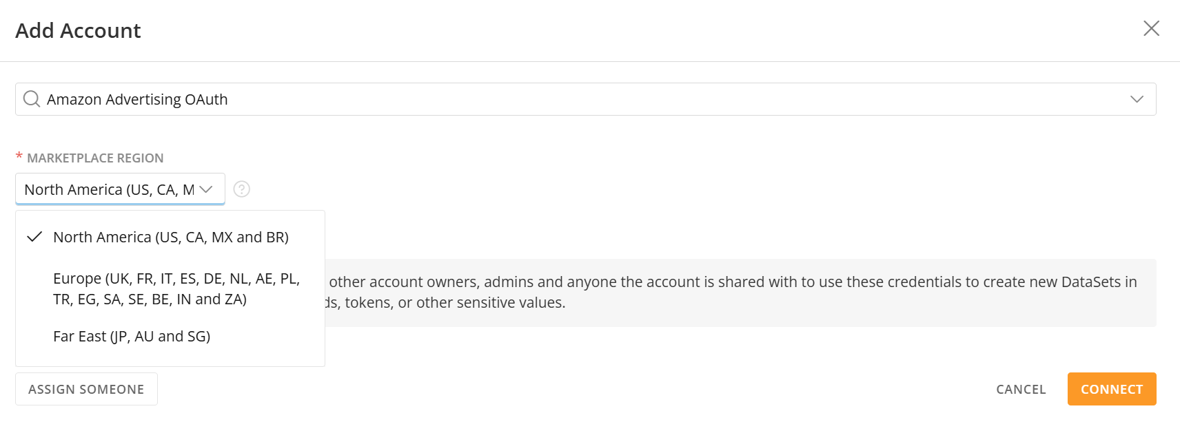 - While creating a new Amazon Advertising account, you need to select the region of the Amazon marketplace you want to access and click Connect.