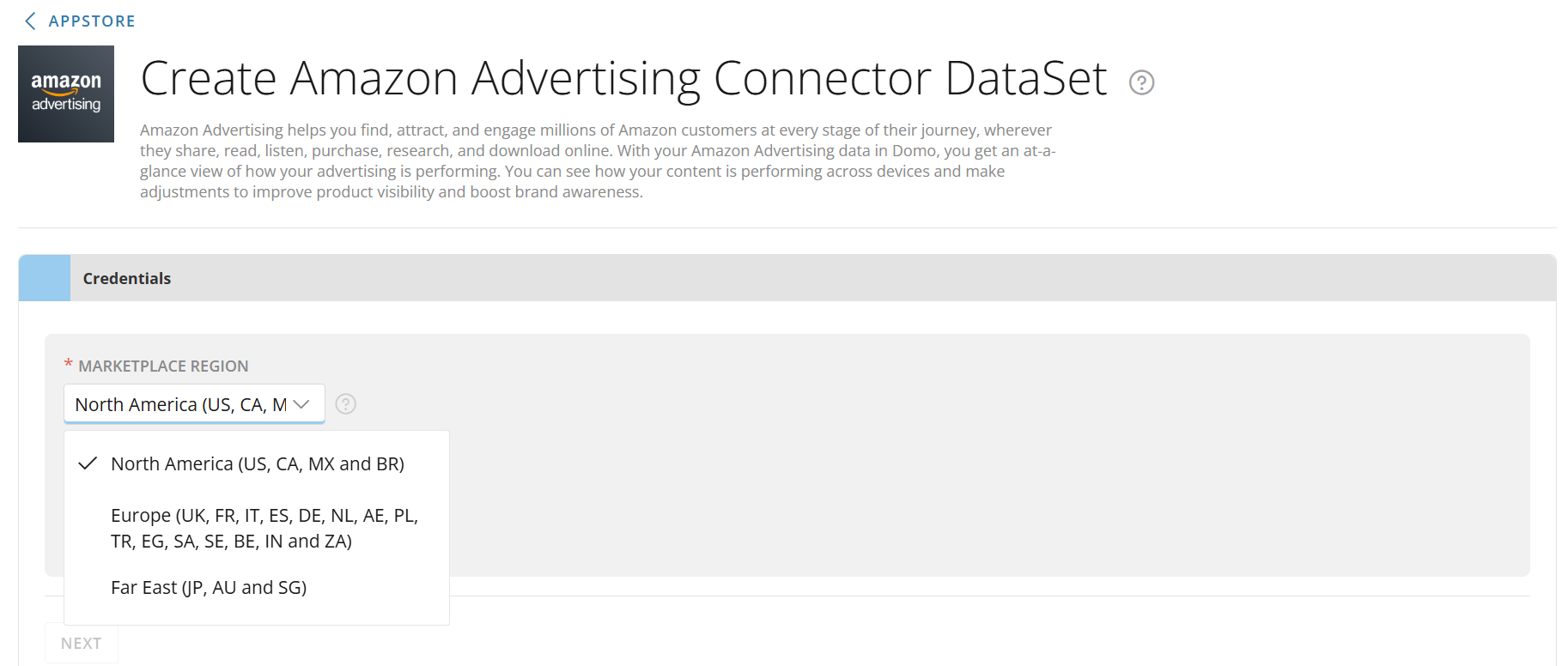 Amazon Advertising connects your brand to Amazon customers wherever they share, read, listen, purchase, research and download online, across devices. Use Domo’s Amazon Advertising connector to retrieve entities reports, performance reports, and portfolio listings. To learn more about the Amazon Advertising API, visit their page (https://advertising.amazon.com/about-api ). You connect to your Amazon Advertising account in the Data Center. This topic discusses the fields and menus that are specific to the Amazon Advertising connector user interface. General information for adding DataSets, setting update schedules, and editing DataSet information is discussed in Adding a DataSet Using a Connector.Prerequisites