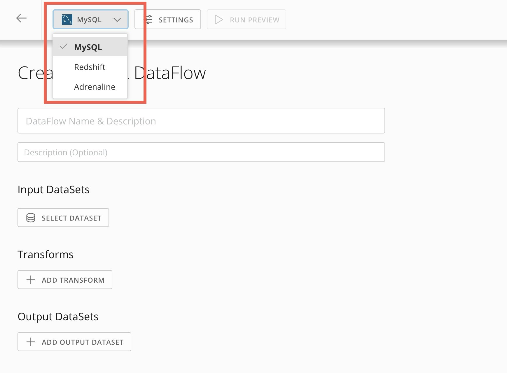 - Select Transform Data > SQL Transforms. The DataFlow creation screen displays.
