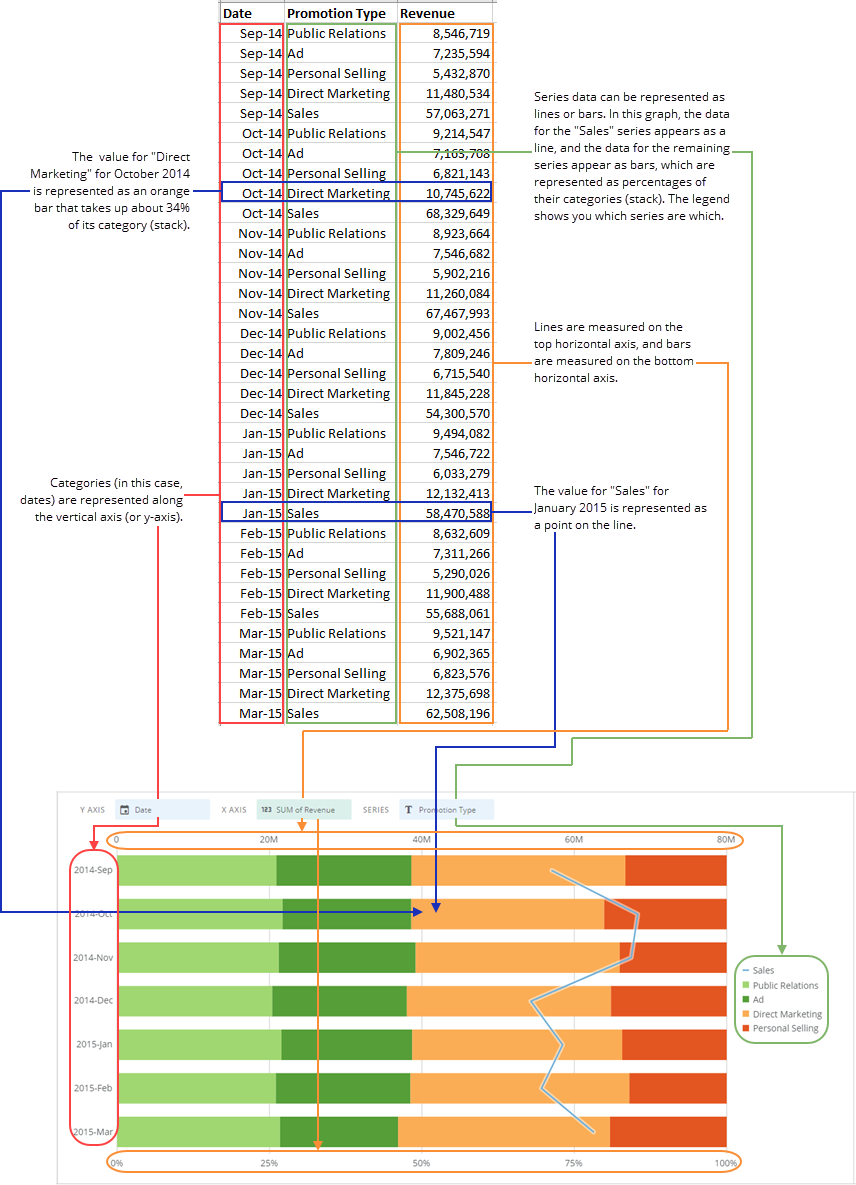 A 100% stacked bar with line chart requires three data columns or rows from your DataSet—one for categories, one for the series in each category, and one for values. For information about value, category, and series data, see Understanding Chart Data. In the Analyzer, you choose the columns containing the data for your 100% stacked bar with line chart. For more information about choosing data columns, see Applying DataSet Columns to Your Chart. For more information about formatting charts in the Analyzer, see Analyzer Overview. The following graphic shows you how the data from a typical column-based spreadsheet is converted into a vertical 100% stacked bar with line chart: