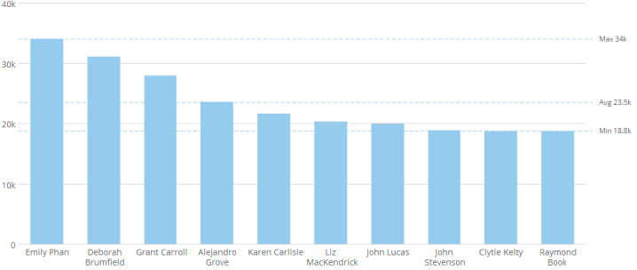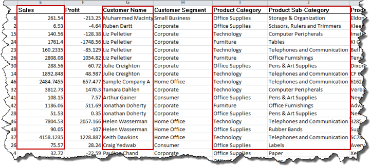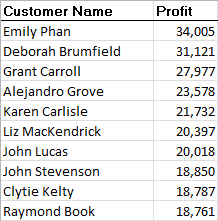 Suppose “Office Guru” sells office supplies to customers throughout the entire United States. The sales manager has created a simple, two-column “Top Customers” chart that shows the top ten highest-paying customers for the last four years. The data for this chart has been gleaned from a much larger DataSet, and appears as follows: