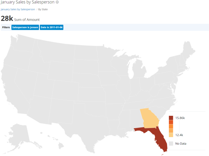 With both U.S. state maps and latitude-longitude maps in which U.S. cities are represented, you can create “zoomed” drill layers by drilling down to the same map. For example, if you had a latitude-longitude map showing values per state and you added the same map as a drill layer, clicking any point in the country-level map would bring up a “zoomed in” state or region level that displayed all of the original data points from that state or region. Results from using this technique vary depending on the map type, your DataSet, and the specific columns you apply. For more information about U.S. state maps, see Latitude-Longitude Map. Video - Using Drill Paths