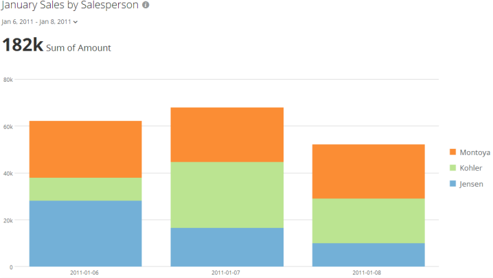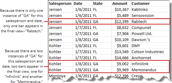 Suppose a company called “WidgetSoft” sells products to different companies located in Florida and Georgia. The following spreadsheet records the sales of the salespeople, “Jensen,” “Kohler,” and “Montoya,” over a period of three days in January, with the specific amounts and customers for each sale: