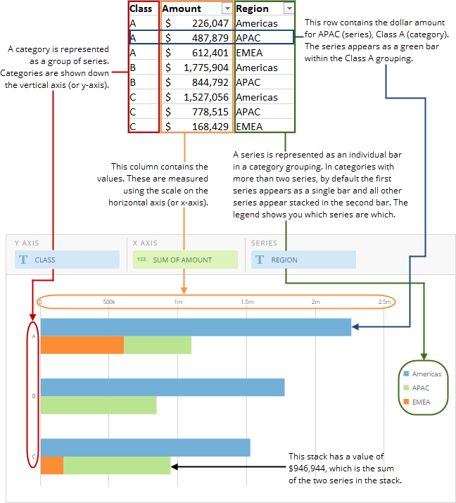 A grouped and stacked bar chart requires three data columns or rows from your DataSet—one for categories, one for the series in each category, and one for values. For information about value, category, and series data, see Understanding Chart Data. In the Analyzer, you choose the columns containing the data for your grouped and stacked bar chart. For more information about choosing data columns, see Applying DataSet Columns to Your Chart. For more information about formatting charts in the Analyzer, see Visualization Card Building Part 2: The Analyzer. The following graphic shows you how the data from a typical column-based spreadsheet is converted into a vertical grouped and stacked bar chart: