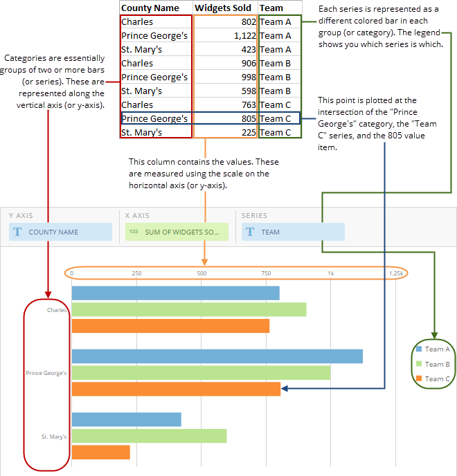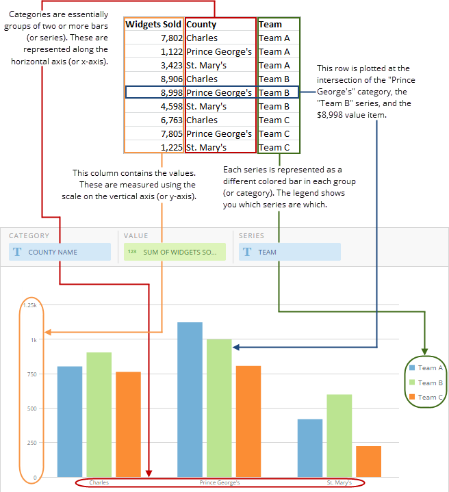 Grouped bar charts require three columns or rows of data from your DataSet—one for series, one for categories, and one for values. If you have more than two series, each additional series is implemented as an additional bar. For information about value, category, and series data, see Understanding Chart Data. In the Analyzer, you choose the columns containing the data for your grouped bar chart. For more information about choosing data columns, see Applying DataSet Columns to Your Chart. For more information about formatting charts in the Analyzer, see Visualization Card Building Part 2: The Analyzer. The following graphic shows you how the data from the series, categories, and values columns in a typical column-based spreadsheet is converted into a vertical grouped bar chart: