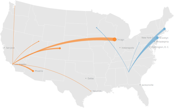 A latitude-longitude route map is a latitude-longitude map in which coordinate points are connected using lines. Two value columns are required. The values in one of these columns is applied to the start points of all given connection lines, and the values in the other are applied to the end points. In the map, differences in the values of start and end points are represented by the thickness of the lines. For example, if a line started out small at the start point of a line and became bigger, this would indicate that the value became larger. If the opposite scenario were true, this would indicate that the value shrank. If the start and end points were the same, the line would have the same thickness throughout. In other respects, a latitude-longitude route map is the same as a latitude-longitude map. The provided coordinates and applied filters determine the “zoom” level of the map. For more information about filters, see Adding Filters to Your Chart. You can also have multiple distinct routes by uploading an optional series column. For information about world maps, see U.S. County Map. For information about troubleshooting when an area in your map does not show data but there is data, see Troubleshooting.Understanding latitude-longitude route maps