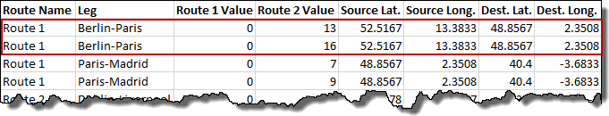You can aggregate like rows in a latitude-longitude route map, and the map points reflect the aggregated values. In the following example, the user uploads a DataSet with two rows for “Berlin-Paris.”