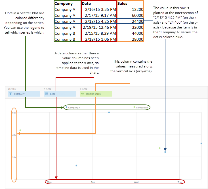 A scatter plot chart requires two columns of data in your DataSet—either two columns for value data or one with value data and one with date-time data. You can also optionally add a series column.