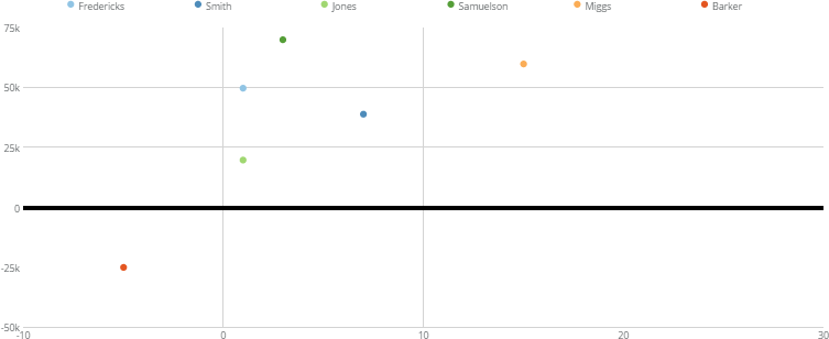 Grid Lines > X Zero Line Width | Determines the width of the vertical “zero line” in bubble and scatter plot charts. This attribute does not work if the zero line is the leftmost line in the chart (that is, the chart must contain negative values). In the example, this property has been set to 5 . | |