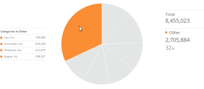 Maximum Slices Before Other | Determines the number of slices in a Pie or Donut chart that are represented as unique slices—all remaining slices in the chart are aggregated into an “Other” slice. In the first example at right, the user entered “6” as the Maximum Slices Before Other value; therefore, the first six slices appear as unique slices, and the remaining slices are grouped into an “Other” slice. In the second example, the user mouses over the “Other” slice, and the legend updates to show the items that have been grouped into that slice. In addition, the total and percentage for the combined “Other” items appears next to the pie. | |